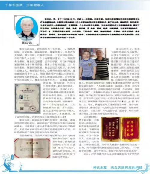 张庆达老师生于一九五二年十二月,在一九七三年七月毕业于江西省下垄矿五七高中,当年十二月下放农村接受贫下中农再教育七七年七月病退返矿,在县工商局做协议工作至七九年。八〇年元月,由下垄矿大集体招收为集体工,二〇一二年办了退休,几十年坚持自学中医中草药技术,为亲友治疗过一些疑难杂症,如骨癌,股骨头坏死,脑瘤,淋巴癌, 乳腺癌,胰腺癌,结直肠癌,肝癌,尿毒症,肾囊肿,癫痫精神分裂症, 穴位损伤,中风后遗症及类风湿乙肝转阴等疑难杂症,效果显著,让股骨头坏死病人得到快速缓解疼痛,短期内达到治愈的目的,能使渐冻症病人快速得到改善,得到亲朋好友好评,当地百姓都说老师在新城立脚是新城人民的福份!